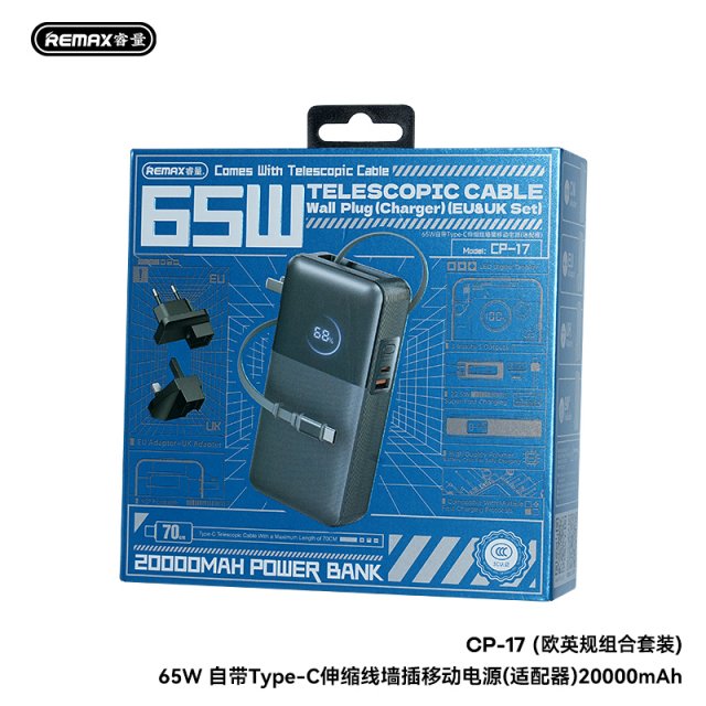 REMAX睿量 65W 自带伸缩线墙插移动电源(适配器) 20000mAh CP-17(欧英规组合套装) 充电宝+充电器+Type-C快充伸缩线+欧/英规转接头 精简出门,出国旅行,一个就够 大容量,超长续航;大功率PD65W,兼容多种快充协议 Type-C伸缩线、Type-C接口支持双向PD65W快充;USB接口支持22.5W超级快充 Type-C伸缩线最长的长度70CM ,收纳自如;LED数显