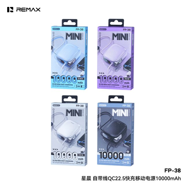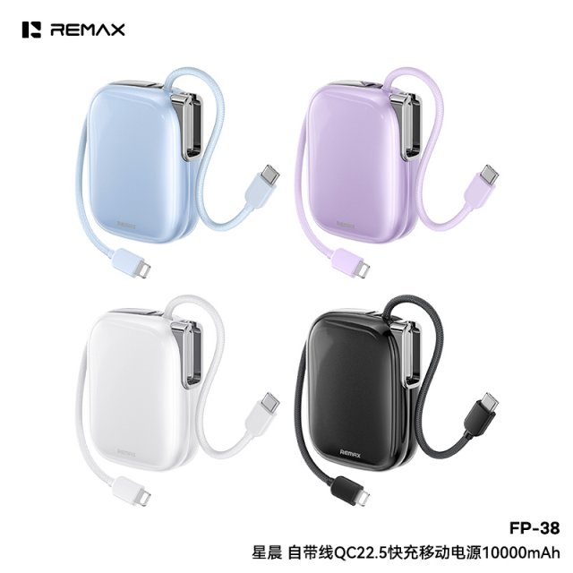 REMAX睿量 星晨 自带线QC22.5快充移动电源 FP-38 体积MINI小巧,创新弧度设计 外观手感油工艺,动感轻薄,高颜值,掌中宝设计 自带双线,出门无需额外带线 Type-C线支持22.5W超级快充 Type-C接口支持双向快充,输出PD20W快充,输入18W快充 Type-C线挂绳设计,拉出即可给设备快速充电 收回便是挂绳,携带方便,多场景适用 Lightning线支持2.4A快速充电