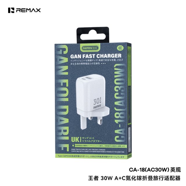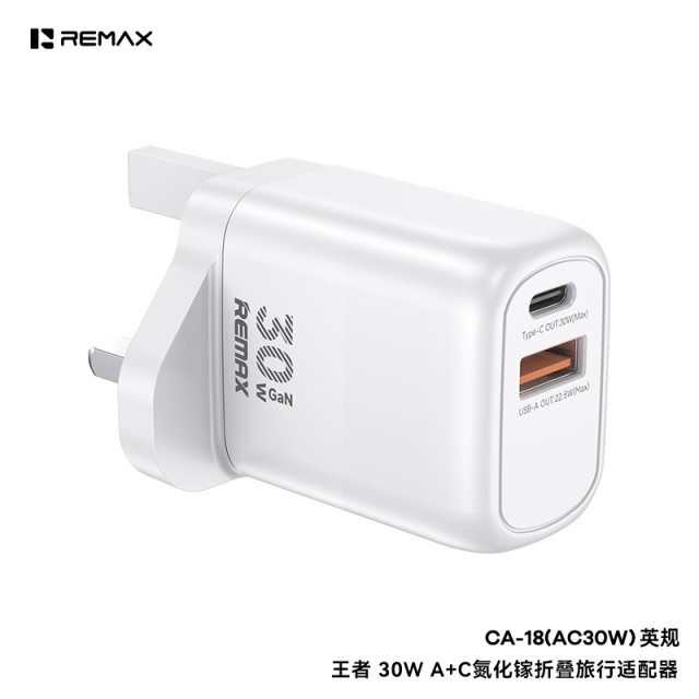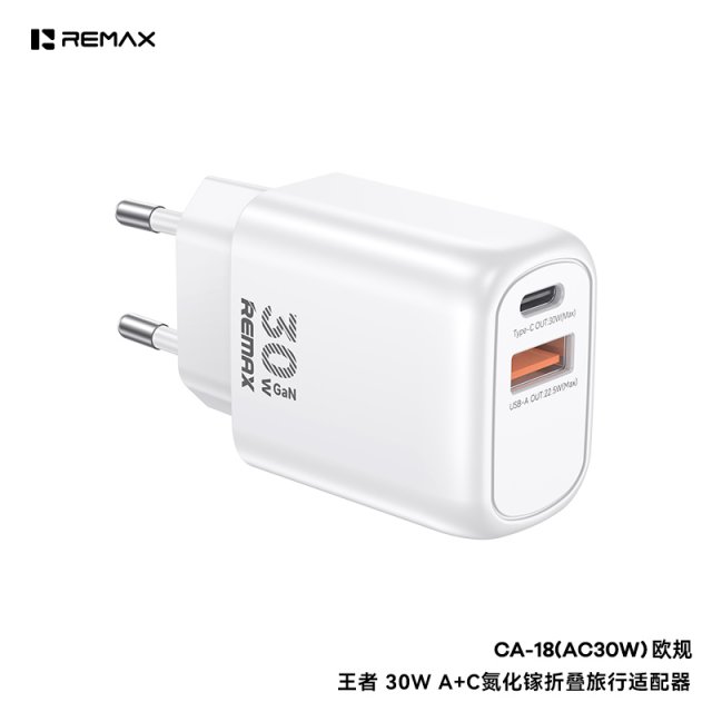 REMAX睿量 王者 30W A+C氮化镓折叠旅行适配器 CA-18(AC30W) 轻薄小巧,方便携带;USB+Type-C双口快充 Type-C、USB支持30W快充 智能识别手机类型,自动调整充电电流 安全不伤设备,支持过流过压过温欠压短路等保护 外壳采用PC料,防火,耐摔经久耐用