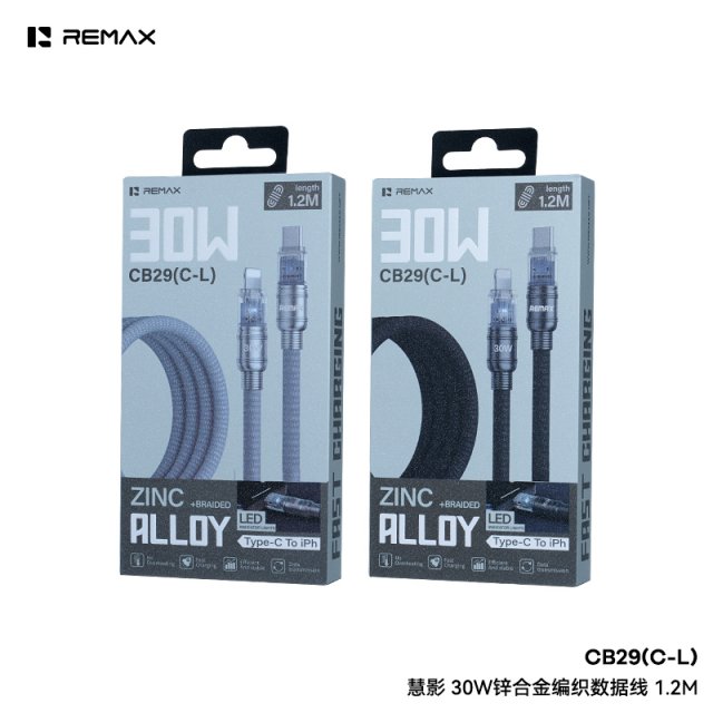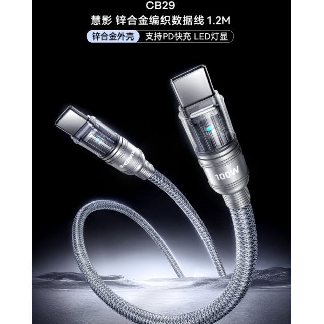 REMAX睿量 慧影 100W锌合金编织数据线CB29 锌合金外壳,高硬度抗氧化 朋克风透明设计,简约时尚 高品质编织线,柔软线身,强韧耐用,拒绝缠绕 带充电指示灯,灯光柔和不刺眼,充电状态一目了然 支持充电、数据传输