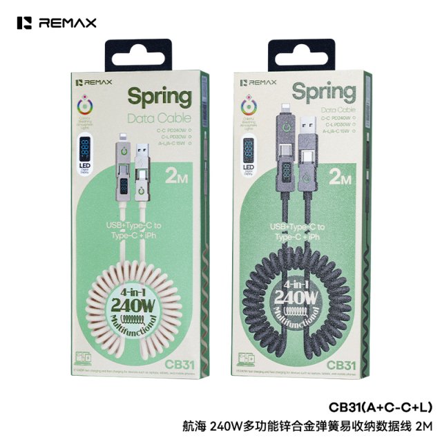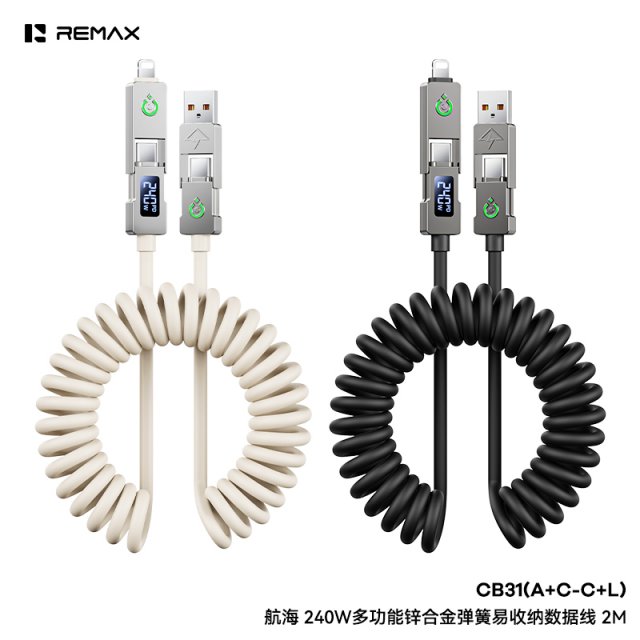 睿量 航海 240W多功能锌合金弹簧易收纳数据线 CB31(A+C-C+L) 2M 锌合金外壳,抗摔耐磨;高弹簧线体,拉伸自如,告别缠绕打结,方便携带易收纳 数显功率清晰可见,随时可关注到充电状态 多功能接口,可任意互换,一线全搞定IPH和TYPE-C接口设备 C-C支持PD240W快充,支持笔记本电脑,平板,手机等设备快充 C-L 支持PD30W快充,支持平板、手机等设备快充 A-L/A-C支