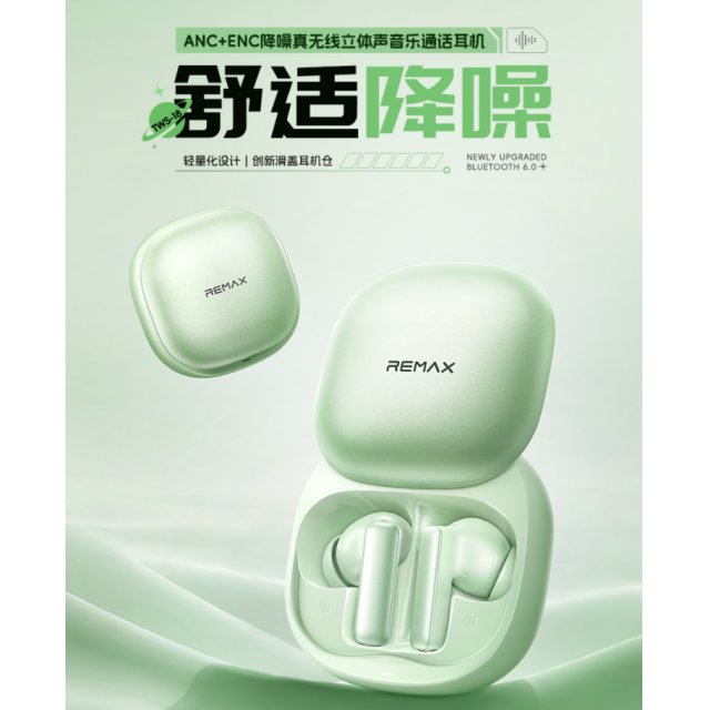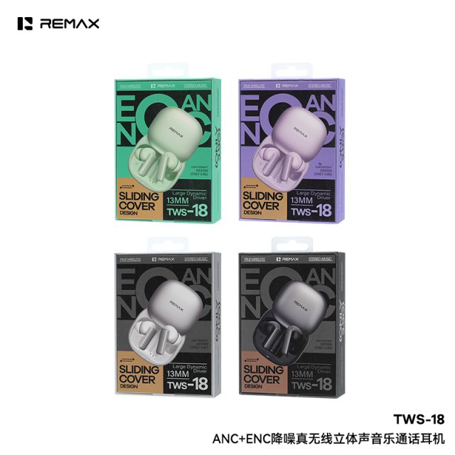 REMAX睿量 ANC+ENC降噪真无线立体声音乐通话耳机 TWS-18 时尚滑盖设计,方便单手操作,提供把玩乐趣 轻量化设计,单耳仅3.9g,云感亲肤耳帽,佩戴舒适无感 ENC双麦通话降噪,宛如面对面对话 ANC主动降噪,隔绝噪音,听你想听