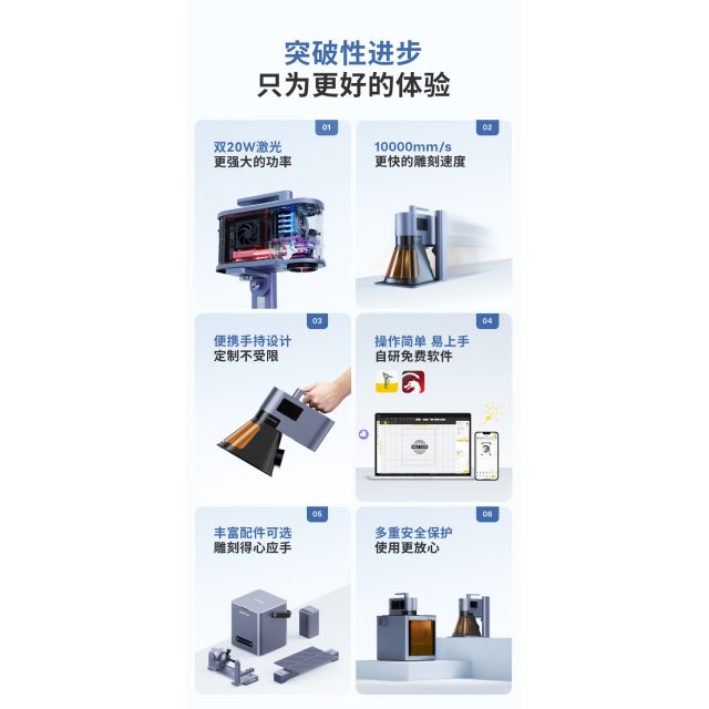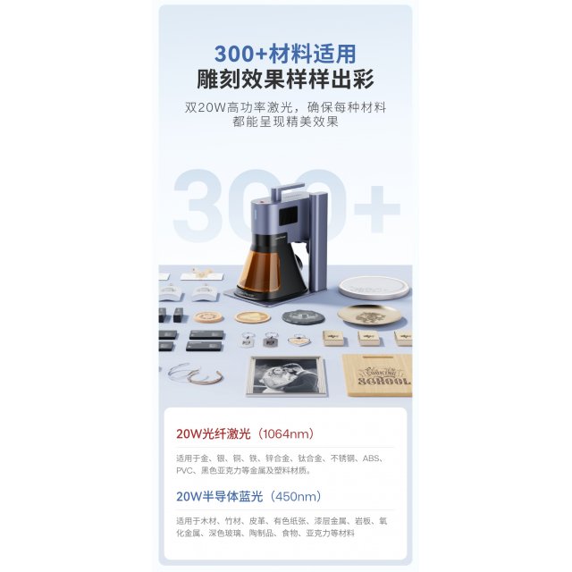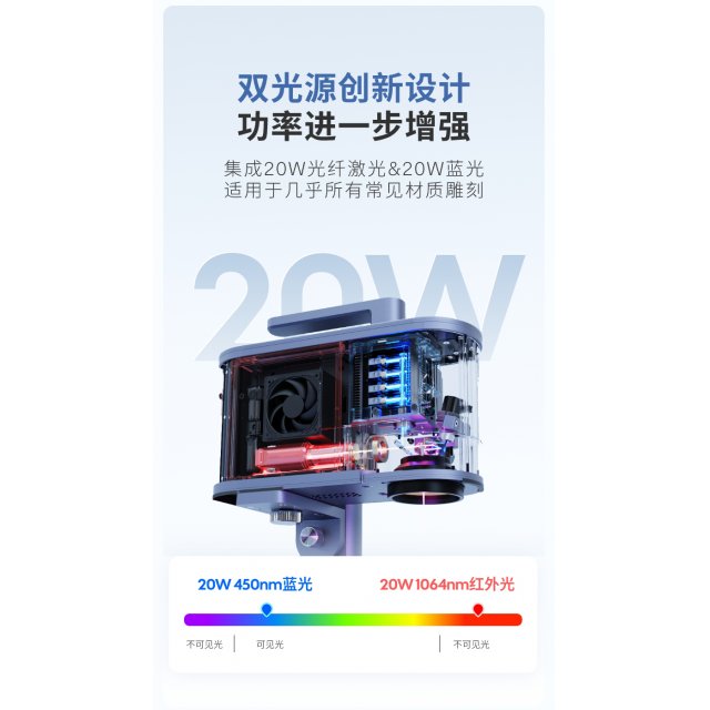 5代双光源,20瓦450nm蓝光功率可切割+雕刻,20W1064nm光纤激光可雕刻+切割薄金属。使用中可以切换光源雕刻不同的材质,可以覆盖金属、皮革、塑料、木材等材质。 1.蓝光可以雕刻的材质有:普通的漆面金属、阳极氧化金属、304不锈钢、竹木,皮革,纸张,食物,塑料,亚克力,有色玻璃,陶制品,部分石材,骨头等亦可雕刻。 2.红外光可以雕刻的材质有:金属,有色塑料