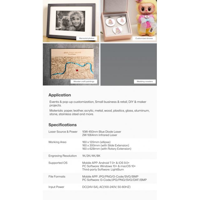 激光啄木鸟4代相当于集成了2代+3代,两个不同的光源(10瓦蓝光+2瓦红外光),可以切换雕刻不同的材质,可以覆盖金属、皮革、塑料、木材等材质。