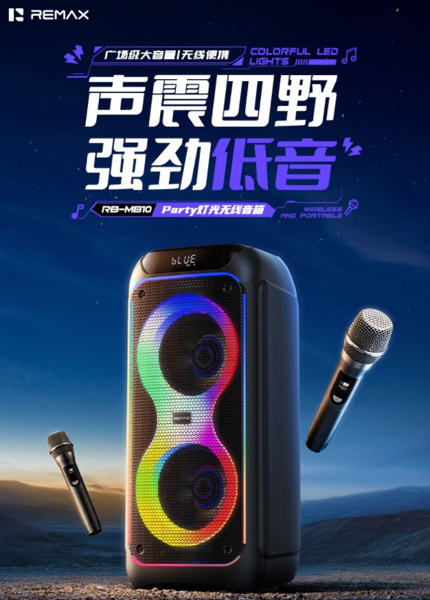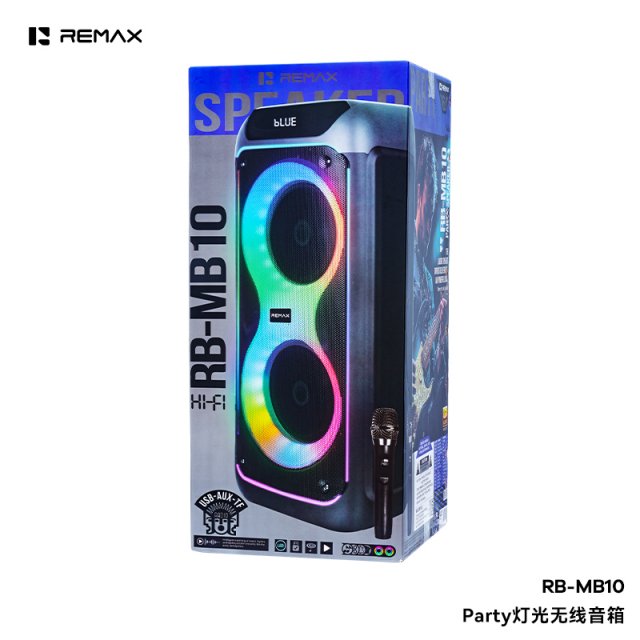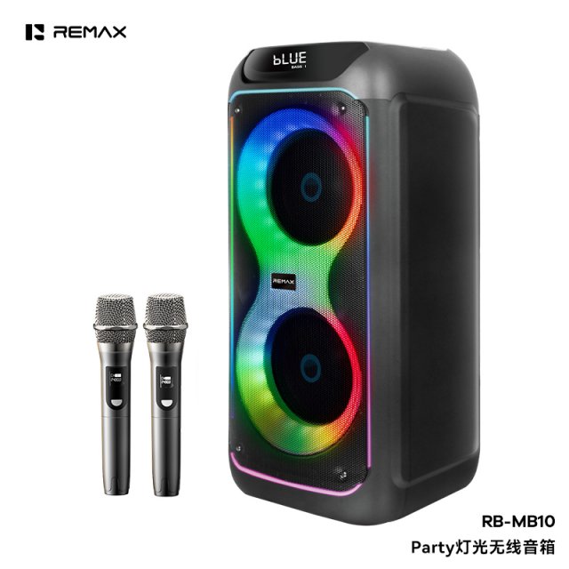 睿量 Party灯光无线音箱 RB-MB10 整体造型便于携带,适合户外活动、野餐、街头表演等移动场景 支持蓝牙连接,USB 播放、AUX 输入等功能 顶部设有多个调节旋钮,可直观便捷地调节音量、低音、高音等参数 配备多彩 LED 灯光,可随音乐节奏闪烁变化,营造出热烈 较大尺寸的扬声器单元,能提供强劲有力的低音效果