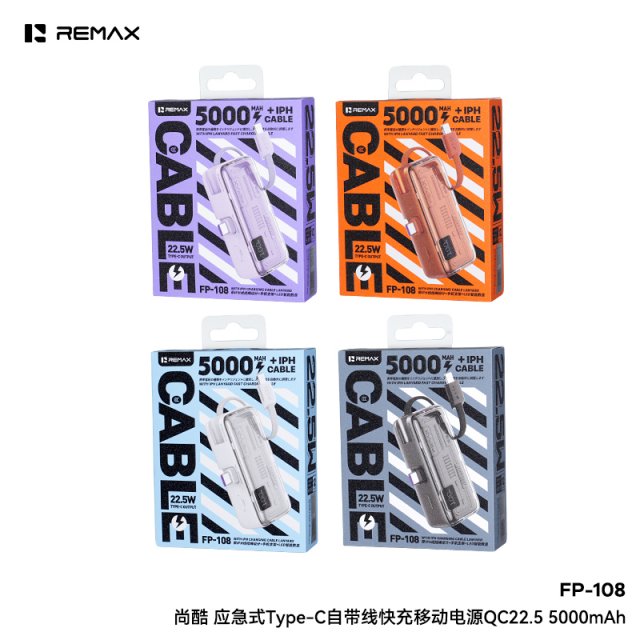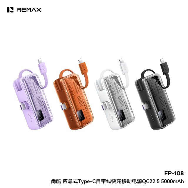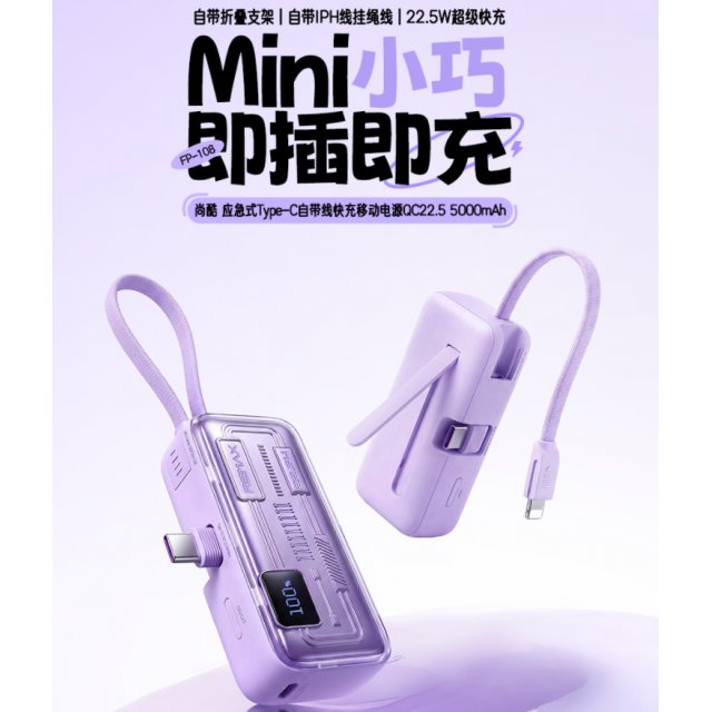 REMAX睿量 尚酷 应急式Type-C自带线快充移动电源 QC22.5 5000mAh FP-108 MINI小巧,掌中宝设计,轻松放入口袋,出行携带零负担 一体设计,即插即用,方便快捷,体积与打火机尺寸一样Mini轻巧便携 Type-C2输出22.5W超级快充,同时兼容PD20W快充 Type-C1接口双向快充,输出PD20W快充,输入18W快充 自带IPH线挂绳设计,拉出即可给设备充电,收回