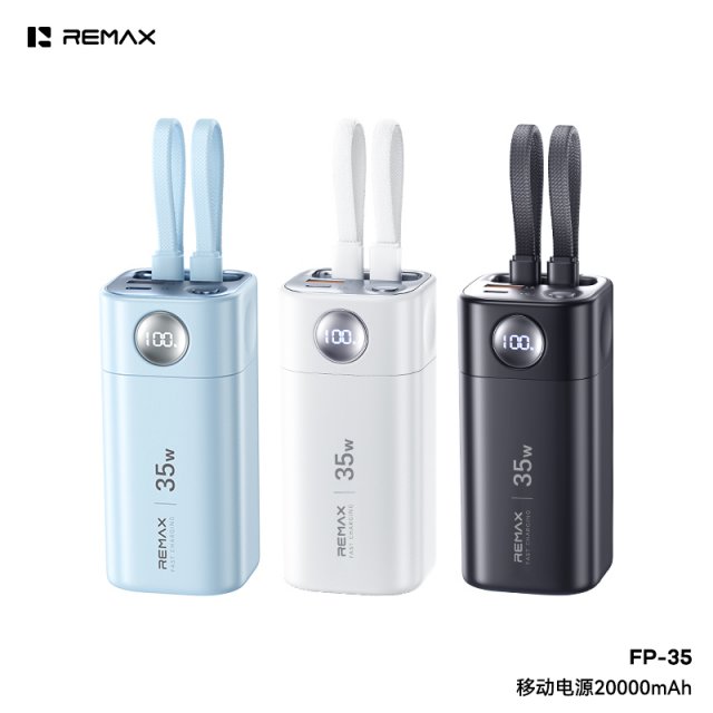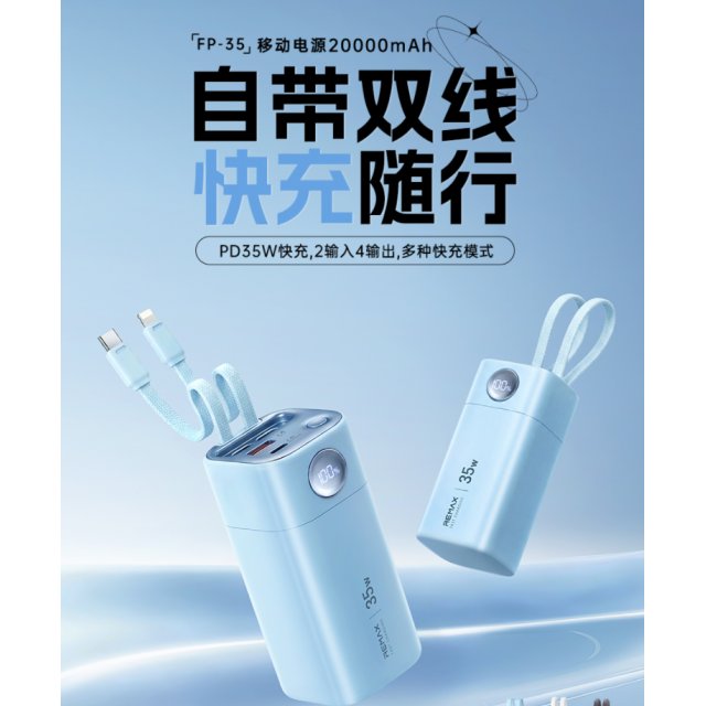 REMAX睿量 移动电源20000mAh FP-35 小体积,大容量,大功率35W,超长续航,快充不断电 自带双快充线,出门无需额外带线,轻松减负 Type-C接口、Type-C线支持双向快充PD35W IPH线支持PD20W快充;USB-A接口支持22.5W超级快充 2输入4输出,多种快充模式,充电无忧 LED数显,电量一目了然;高品质电芯,性能稳定,可随身携带登机