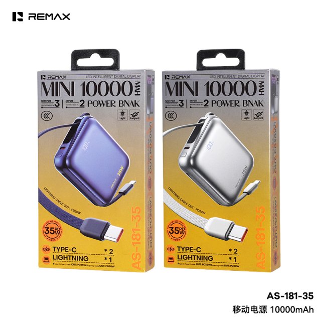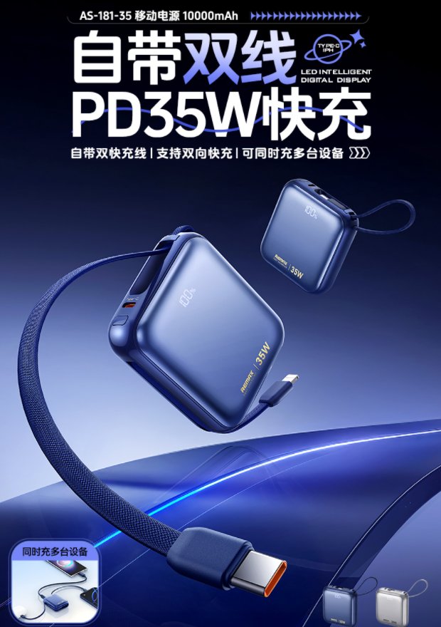 REMAX睿量 移动电源 10000mAh AS-181-35 小体积,PD35W大功率快充,10000mAh大容量,满足日常需求 金属质感,揣兜入包不占地,出行续航无压力 自带双快充线,告别线材累赘,出门无需额外带线 随取随充超便捷,通勤、差旅减负更省心 自带Type-C线拉出即可给设备充电,收回可做成挂绳,方便各种场景使用 LED智能数显,电量一看便知;2输入3输出,多种快充模式,满足多设备
