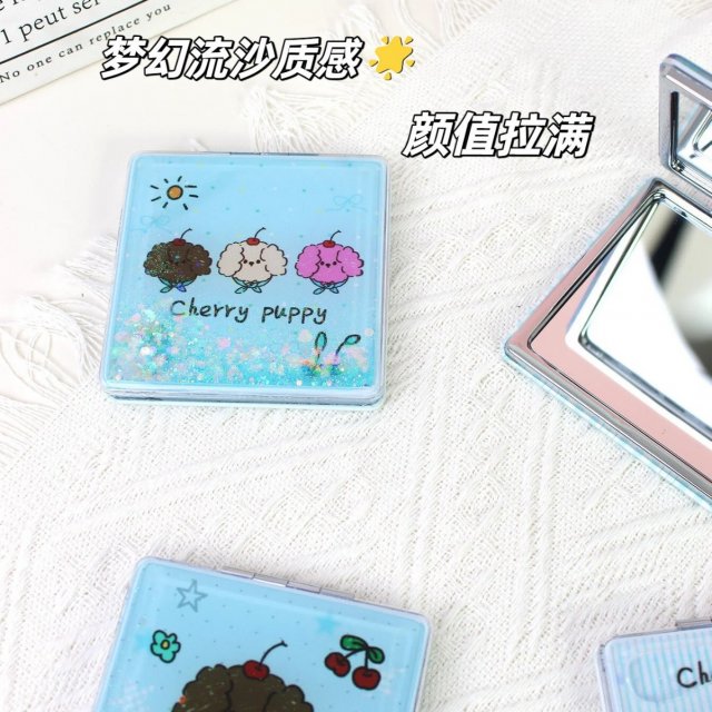 创意流沙INS风卡通双面化妆镜女生小镜子补妆镜折叠镜随身便携镜