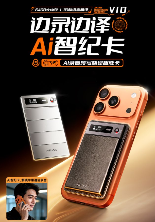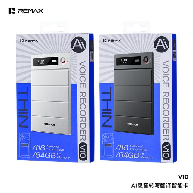 睿量 AI录音转写翻译智能卡 V10 AI录音笔,AI芯片,专业降噪处理,双麦降噪,更好的录音品质 双麦克风,让收录的声音清晰如现场,苹果手机通话录音 骨传导更强的传感器,更准确的拾音 一键录音,快捷方便 录音设备和手机一对一绑定,录音数据更安全(防丢) 3.4mm超薄机身,吸附手机上可忽略整体厚度 400mAh大电池,超长待机可达200天,持续录音32小时 真正强大AI, 智能简洁APP AI实