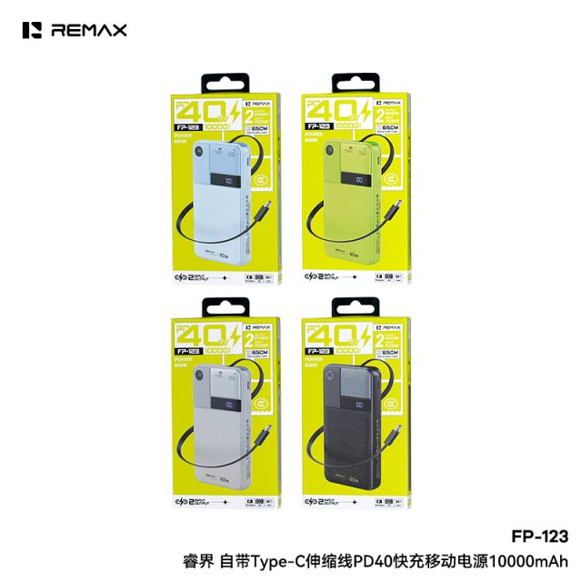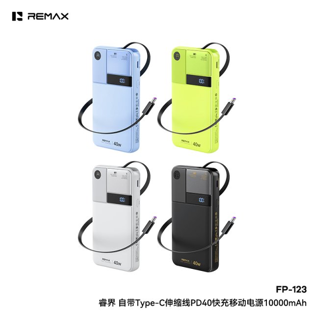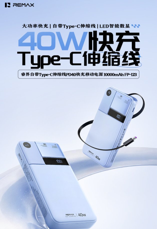 睿量 睿界 自带Type-C伸缩线PD40快充移动电源 FP-123 轻薄便携,PD40W大功率快充 自带Type-C快充伸缩线,伸缩自如,多场景适用,出门无需额外带线 Type-C、Type-C伸缩线支持双向快充,输出PD40W快充,输入PD30W快充 LED智能数显,电量一目了然;2输入2输出,兼容多种快充协议,充电无忧 聚合物优质电芯,性能稳定,可随身携带登机