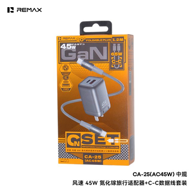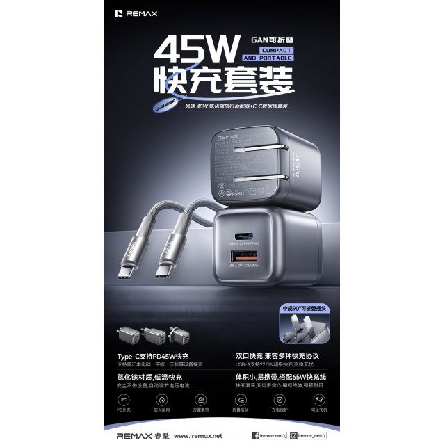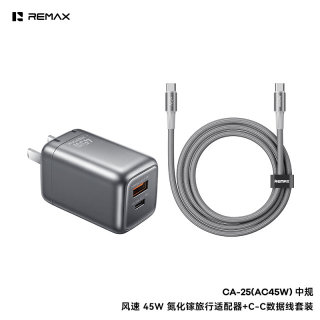 睿量 风速 45W 氮化镓折叠旅行适配器+C-C数据线套装 CA-25(AC45W) CN EU UK 体积小,方便携带 氮化镓材质,低温快充 Type-C支持PD45W快充,USB-A支持22.5W超级快充 双口快充,兼容多种快充协议 自动调节电压电流,支持笔记本电脑、平板、手机等设备快充 支持过流过压短路等保护