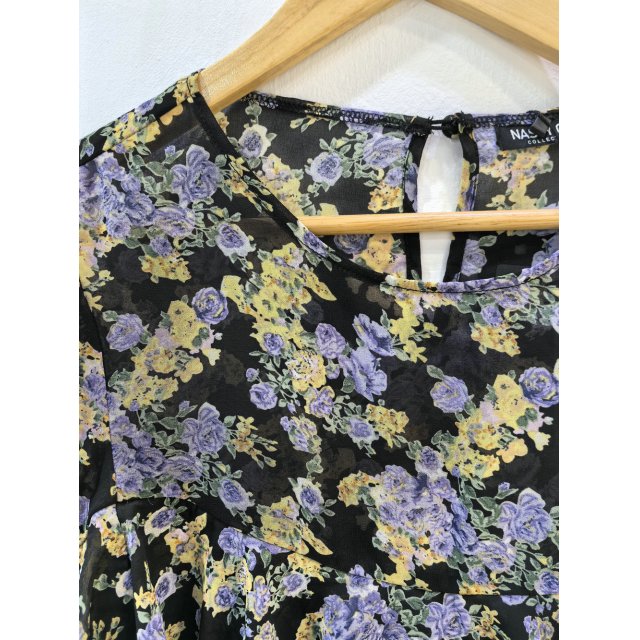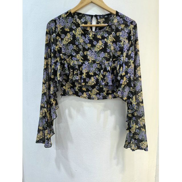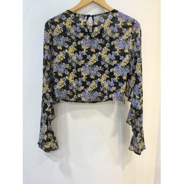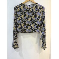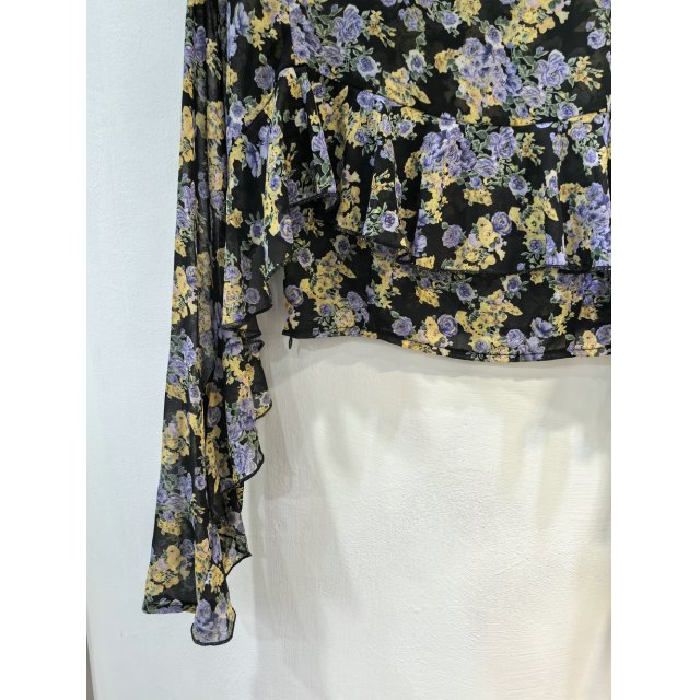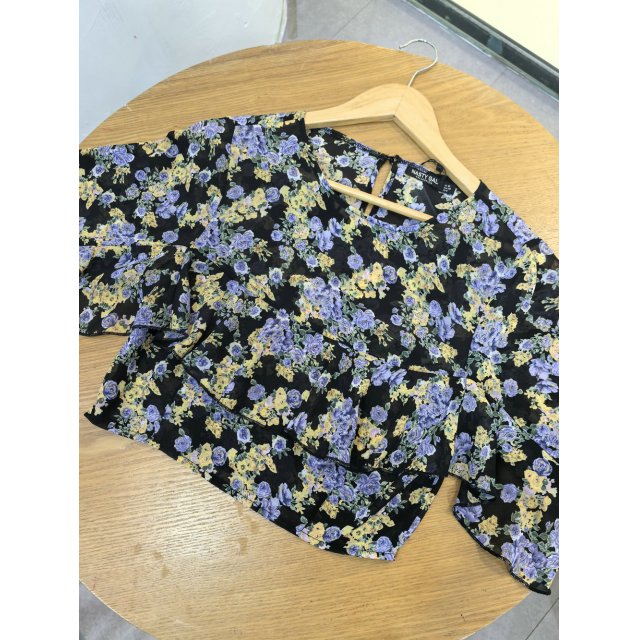 - 法式度假风碎花圆领荷叶边短衫
